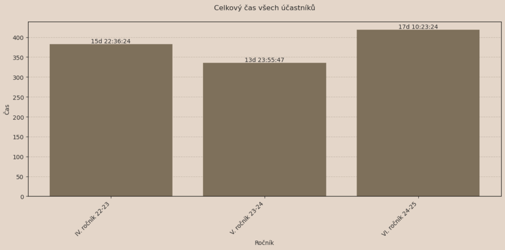 | Celkový čas všech účastníků | 17 dní 10:23:24 | 13 dní 23:55:47 | 15 dní 22:36:24 |